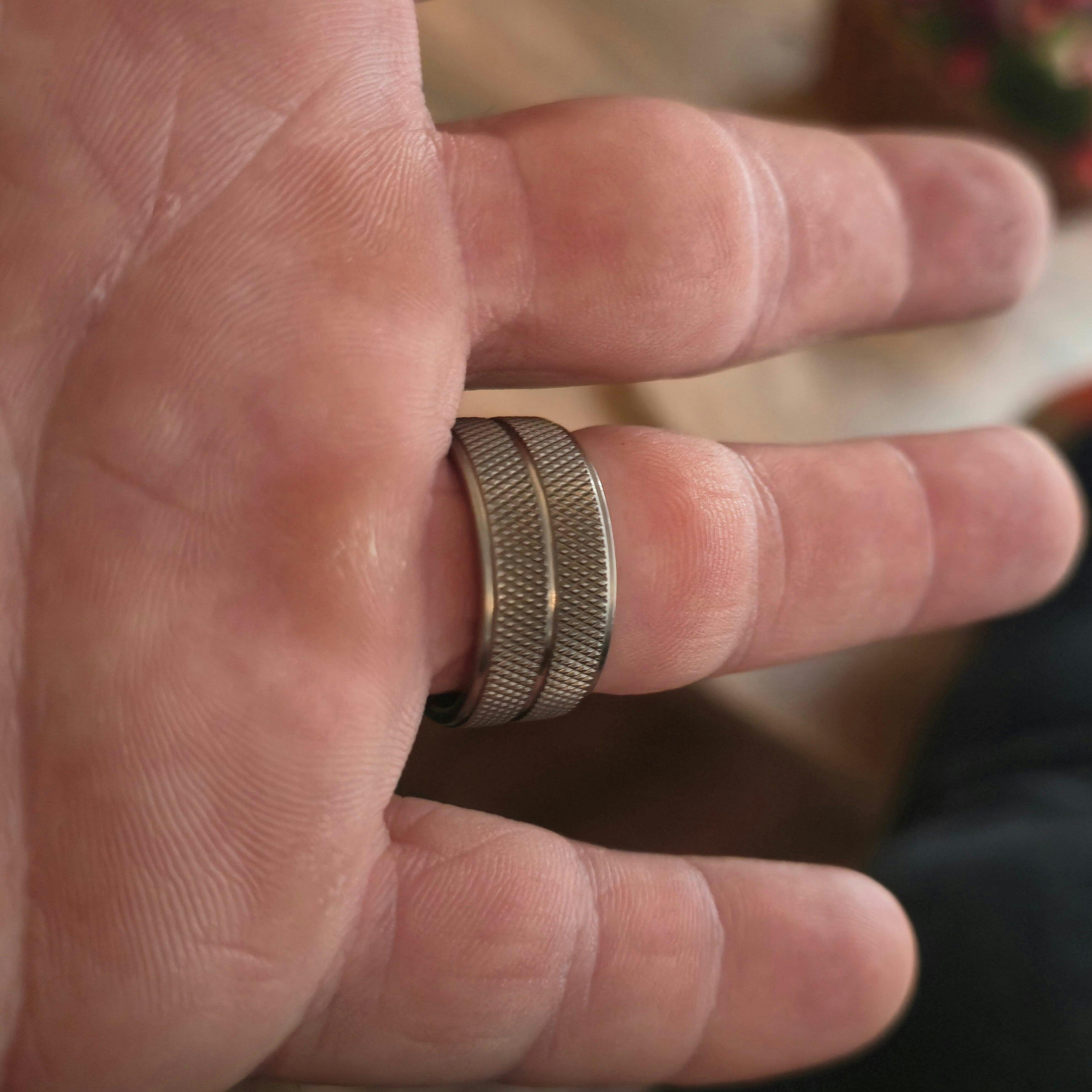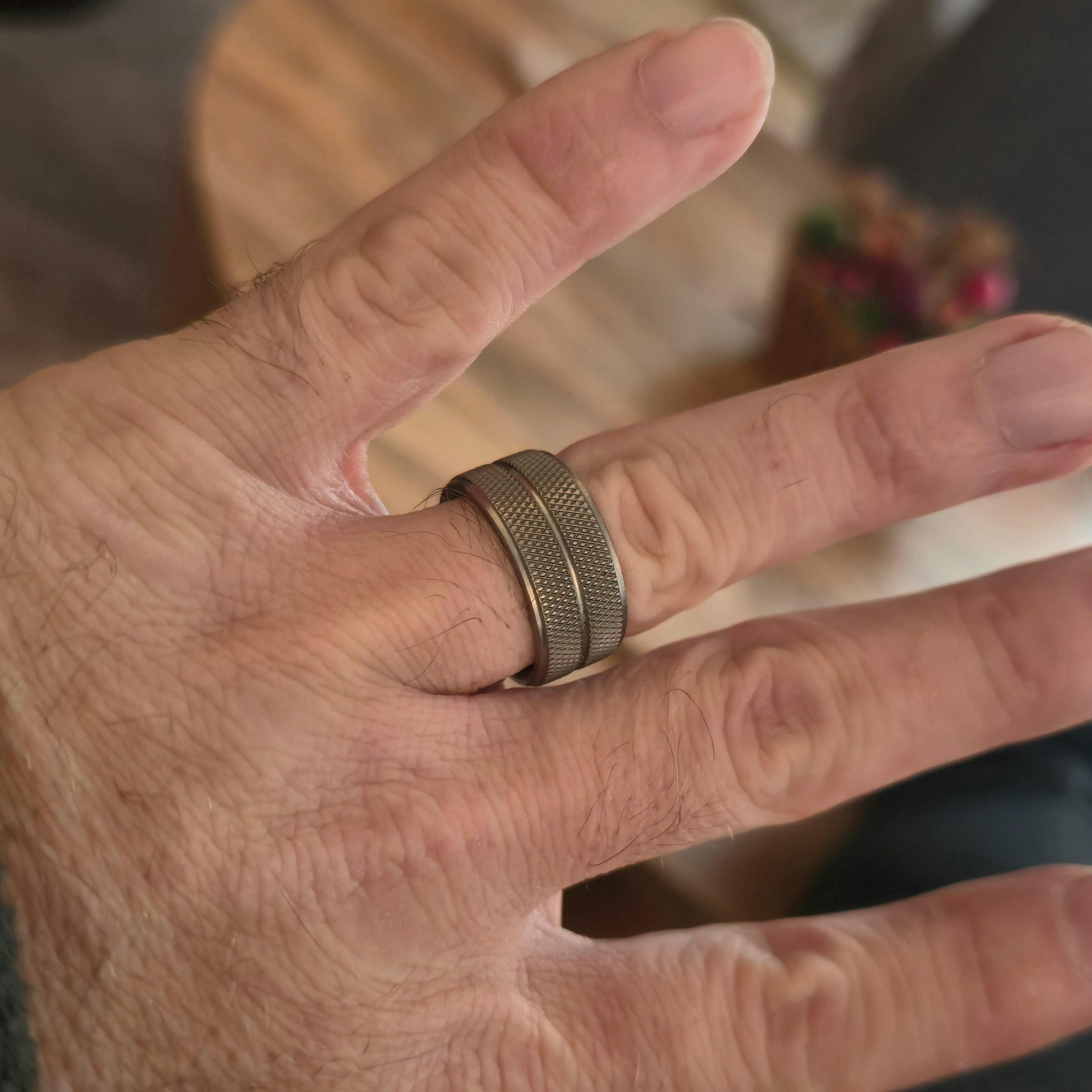 The Apex ring is the polar opposite of a traditional, boring men's wedding bands. The anti-jewelry! This ring is as far as you can get from the all too common, plain, shiny men's band. The Apex ring is constructed from solid titanium, that means that it's super lightweight on your finger and durable too! The texture is a prominent feature of the ring, but it is smoothed out so it IS NOT sharp and catching. Free shipping in the USA! Every Richter Scale ring is covered by our 100% Guarantee |