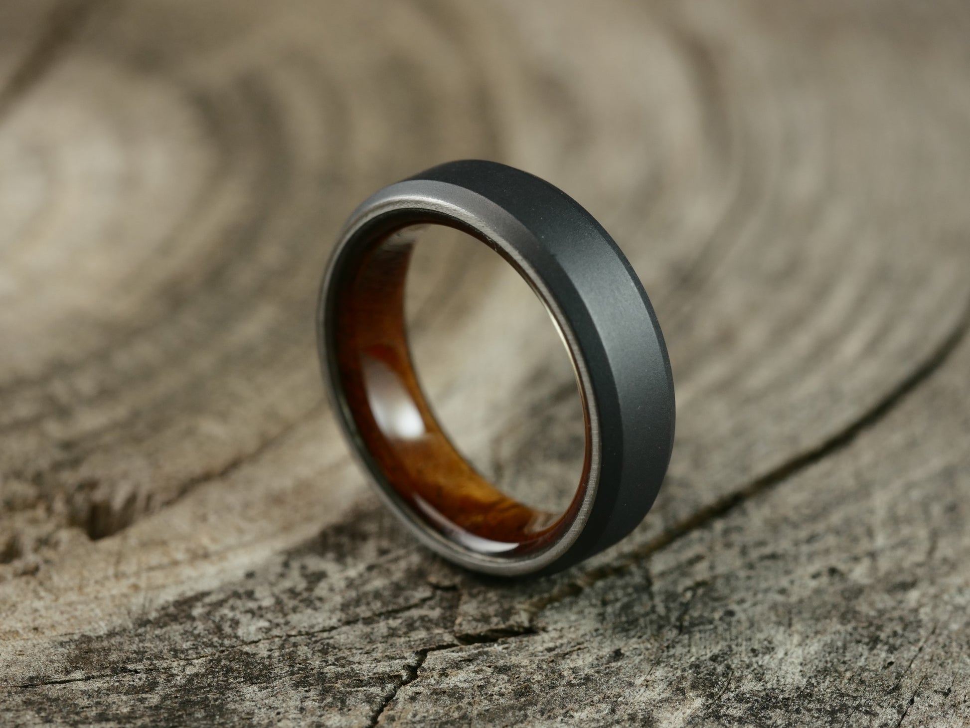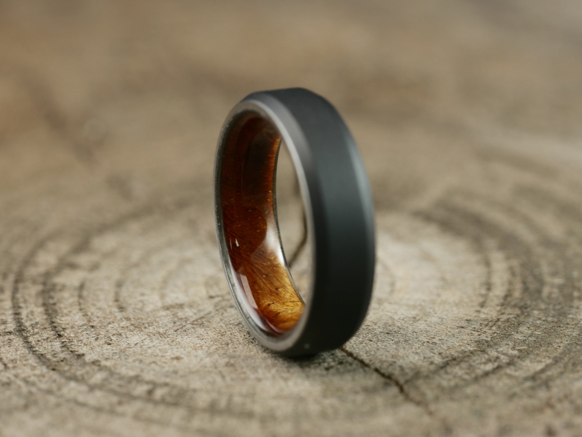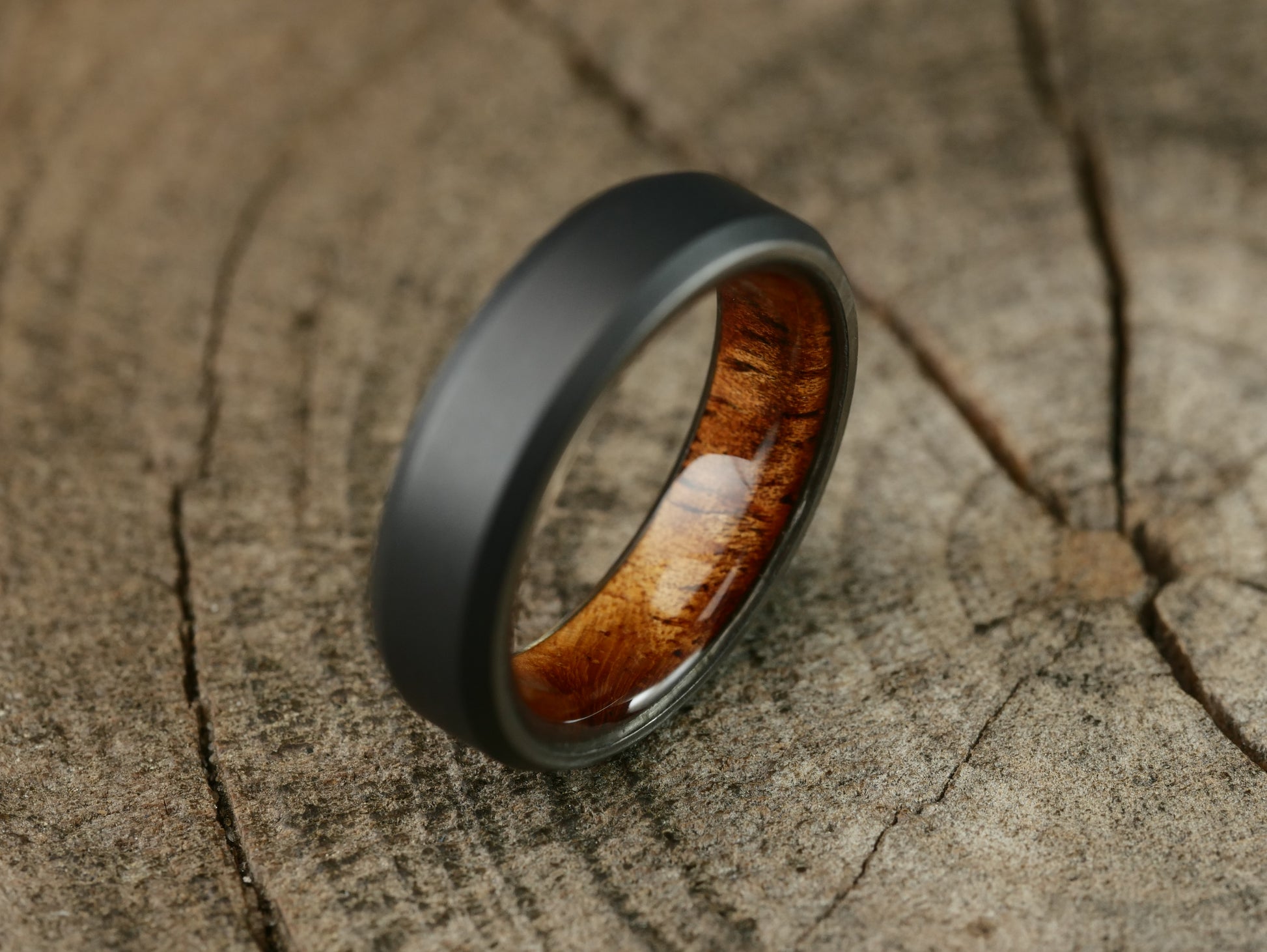 This men's wedding ring is perfect for those that don't want a traditional shiny metal Super-strong titanium with a matte black finish is perfect for those who like something a little more unorthodox! The liner is crafted from beautiful Hawaiian Koa and given a comfort fit with a 100% waterproof finish Free shipping in the USA! Every Richter Scale ring is covered by our 100% Guarantee |
