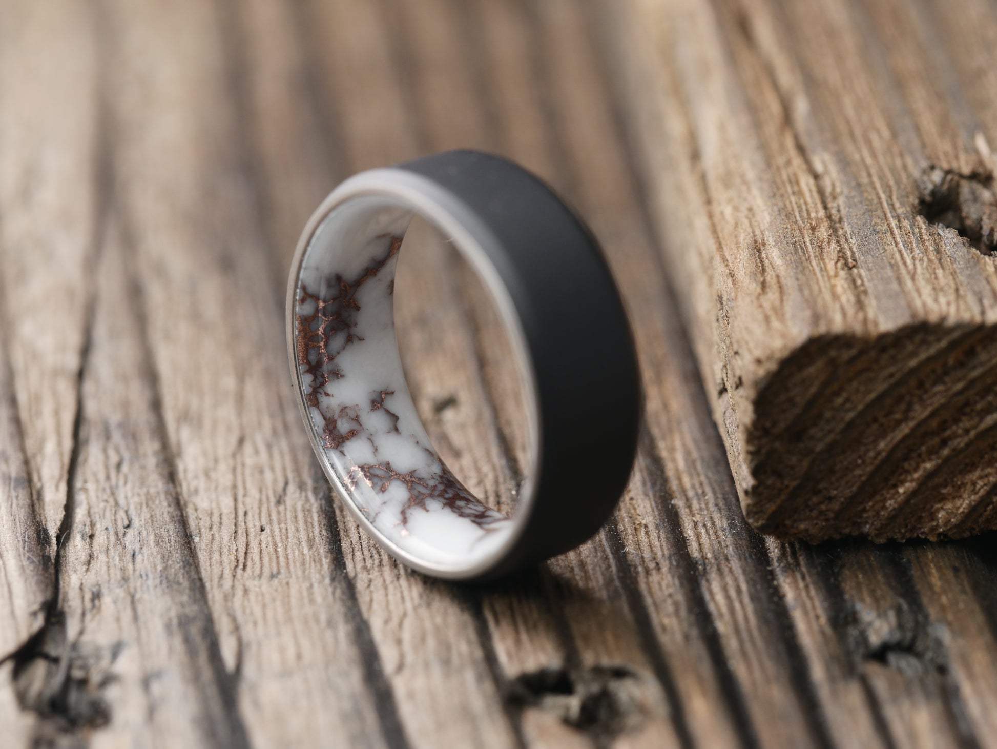 I believe a wedding band should be unique! This handcrafted titanium band has been given an awesome matte black finish and contrasting liner made from white marble composite stone with copper matrix (note copper will naturally patina with wear), all meticulously crafted and given a comfort fit designed for comfortable long-term wear. The ring is 100% waterproof, and of course carries my lifetime guarantee!