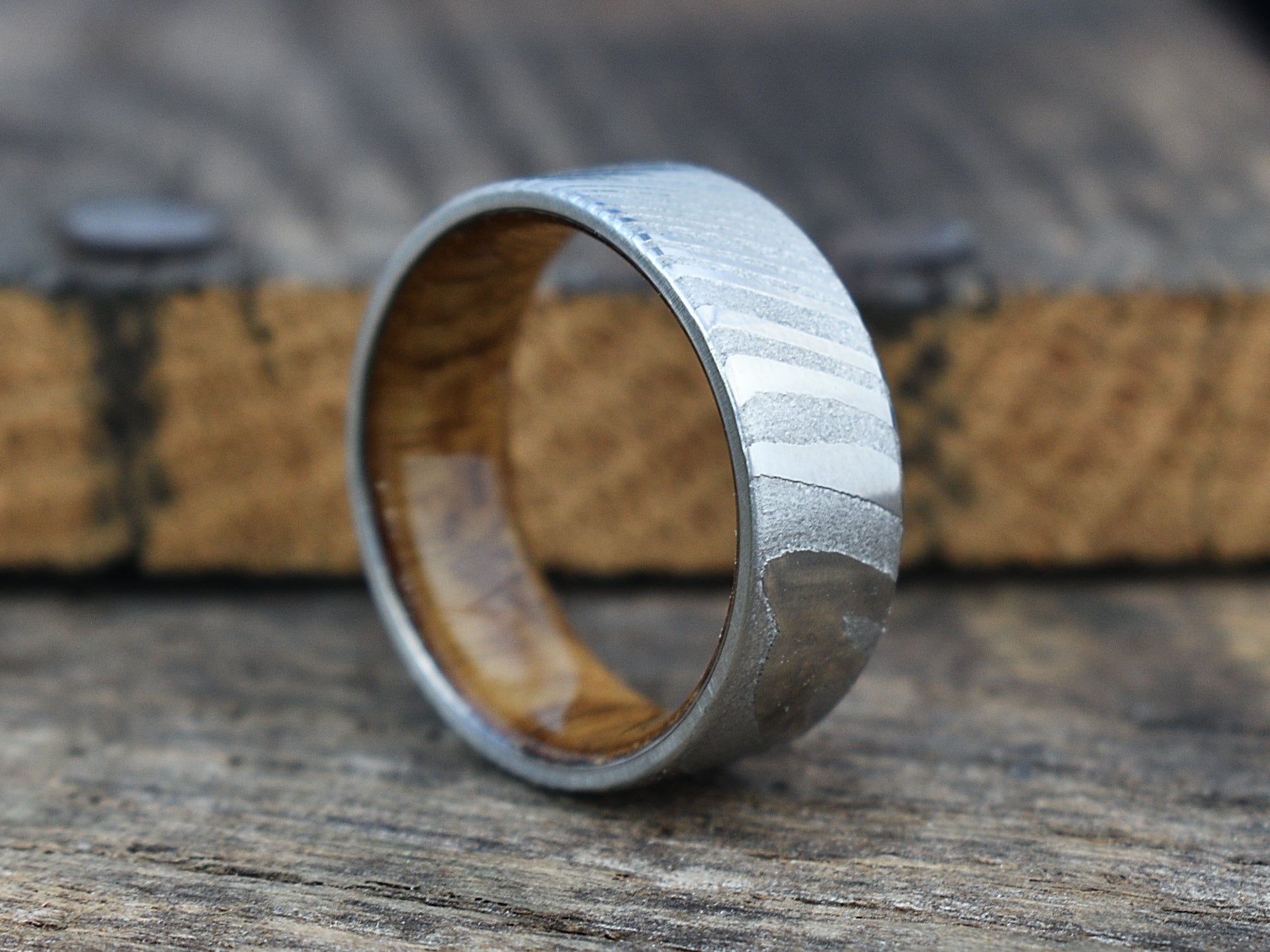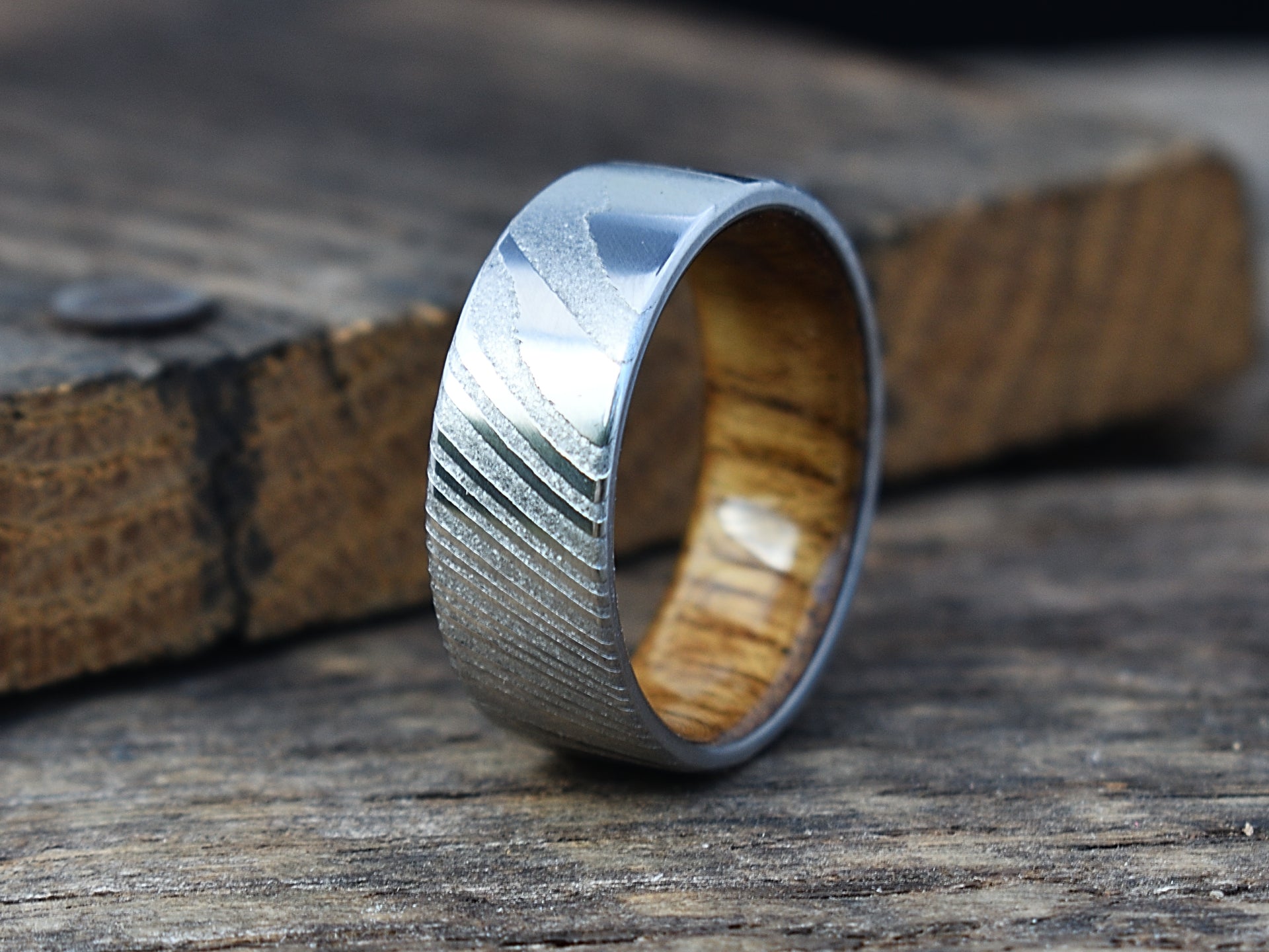 This men's wedding band is handcrafted start to finish in the Richter Scale Rings studio in FL, USA from jewelry grade Stainless Damascus Steel that won't rust or tarnish! The Teak wood liner is made with a comfort fit and 100% waterproof finish designed for long term wear, and of course carries my lifetime guarantee!