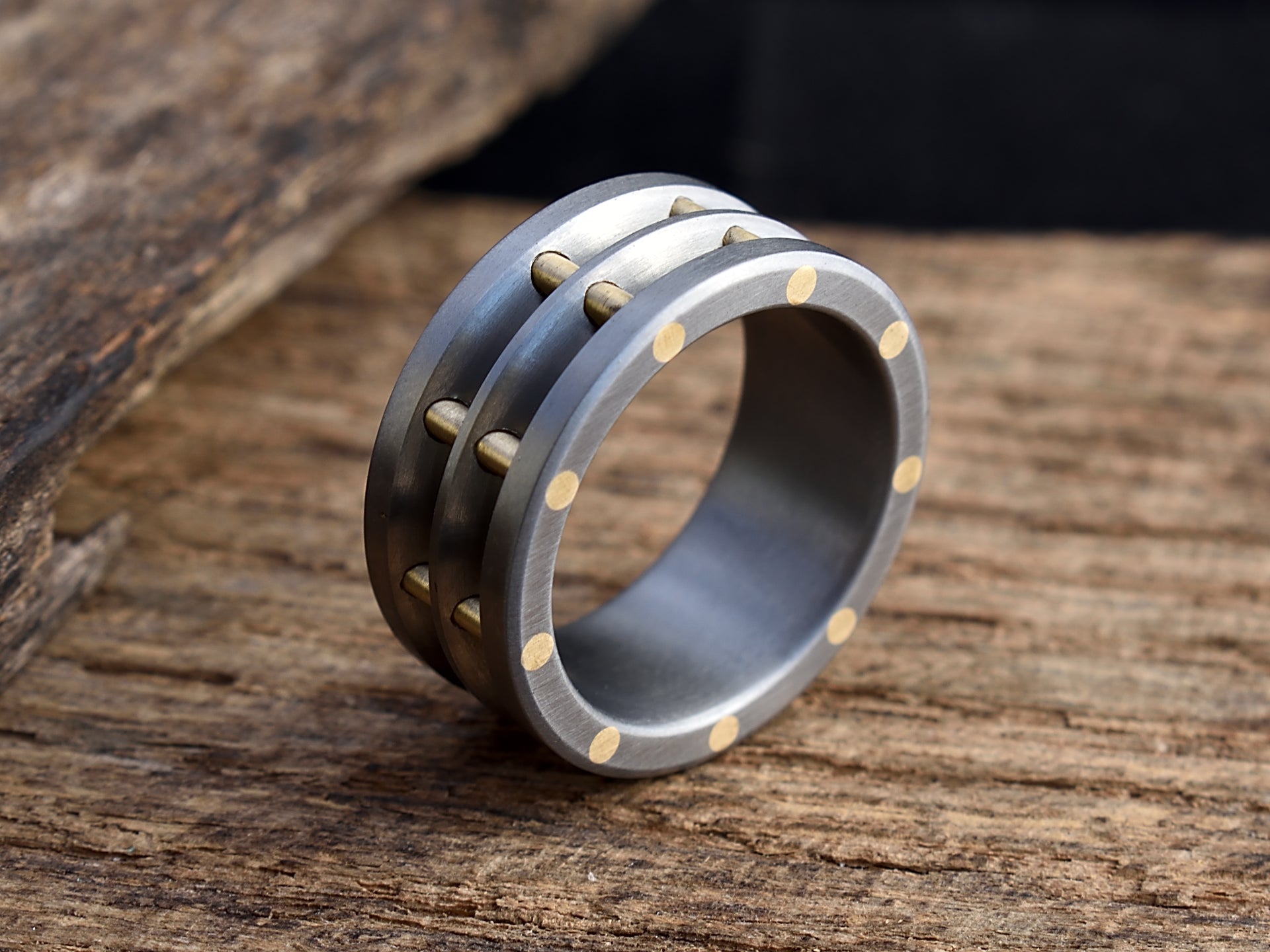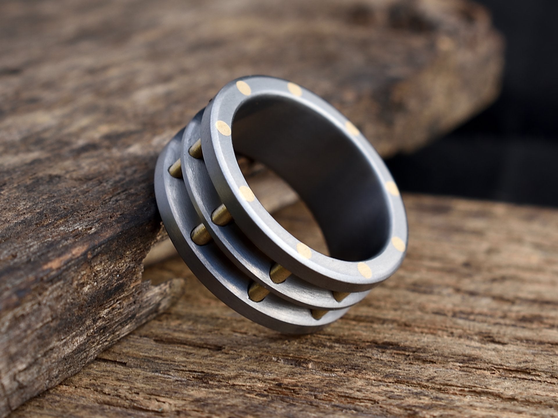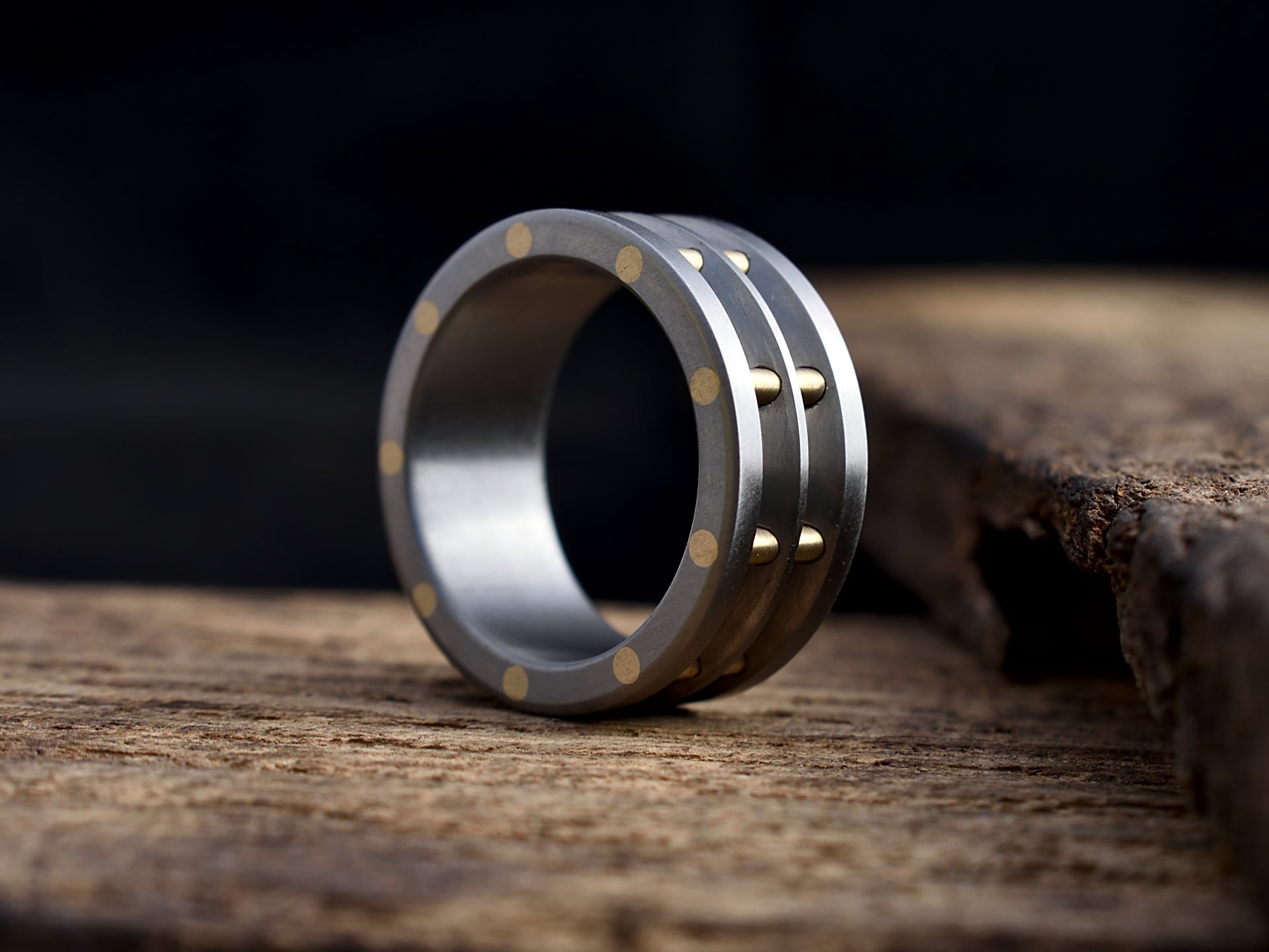 This highly industrial/steampunk ring is built from solid titanium and brass rivets for a completely unique, one-of-a-kind look! Forget about boring cookie cutter wedding bands, and get something that will really turn heads! Free shipping in the USA! Every Richter Scale ring is covered by our 100% Guarantee |