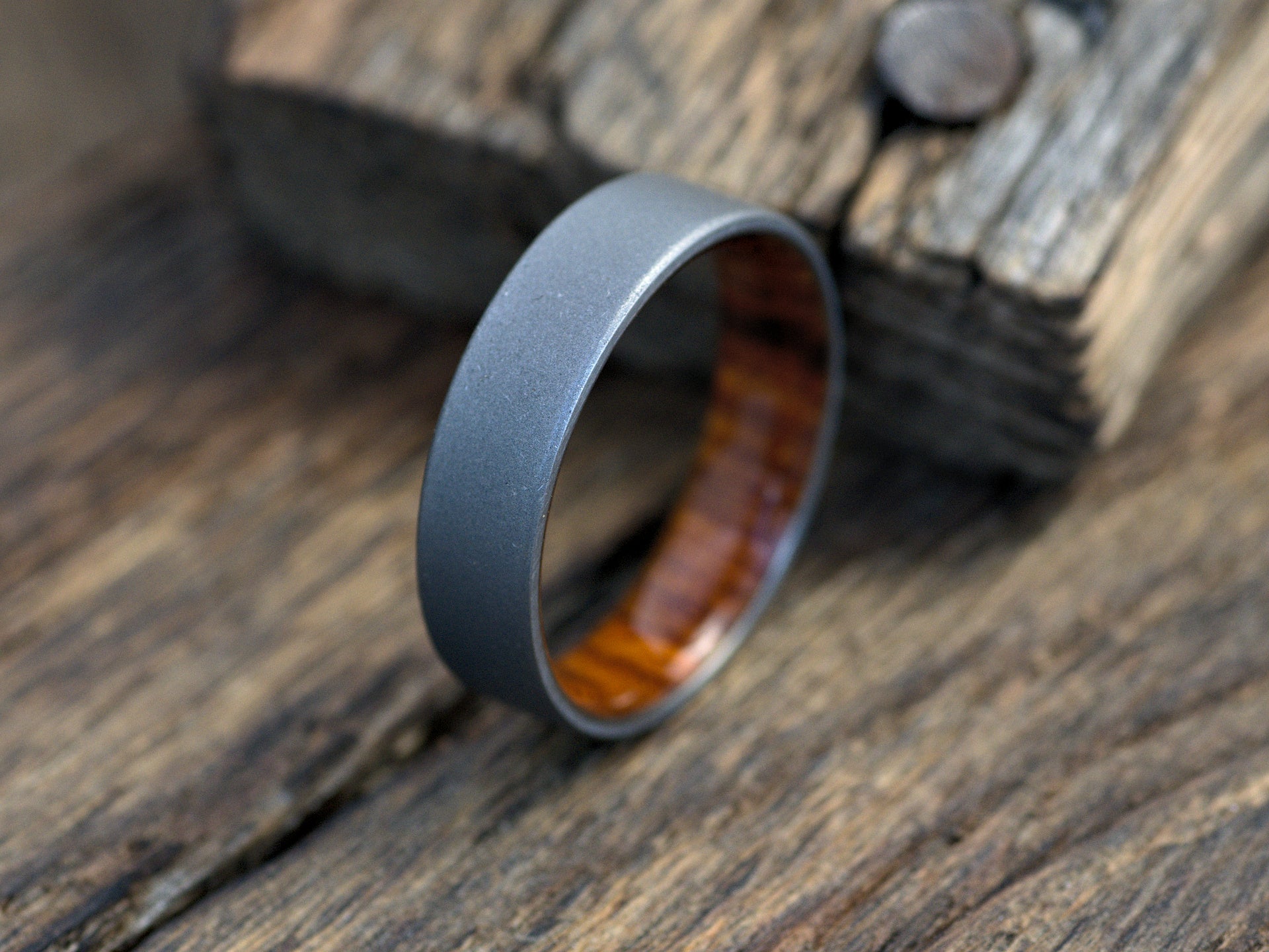 This men's wedding band has the durability of super strong aerospace grade titanium and is given a stonewashed finish which (in addition to looking amazing) is an excellent, durable finish that hides extremely well any nicks and dings that inevitably show up with day-to-day wear. The liner is crafted from beautiful cocobolo wood and given a comfort fit with a 100% waterproof finish for long-term wear and of course, carries my lifetime guarantee!