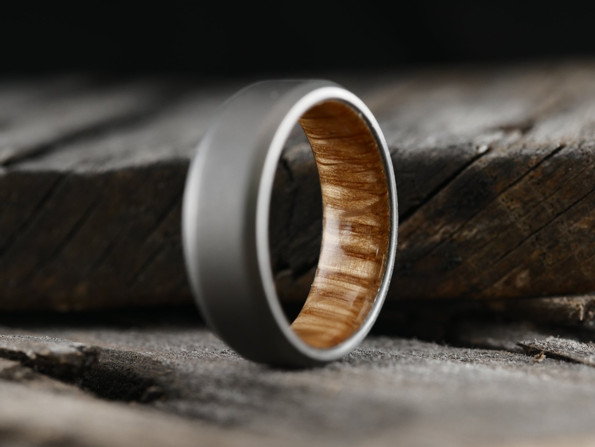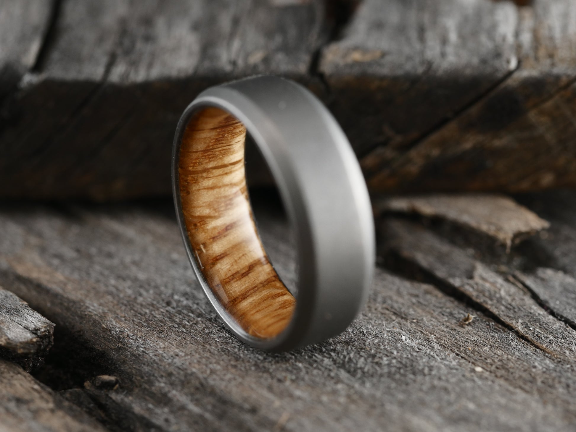 The liner is crafted from wood from a genuine whiskey barrel! (BTW the raw wood smells amazing, but you can't smell it once the ring it finished.)