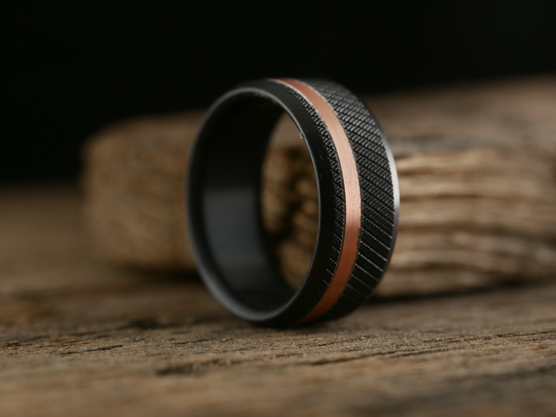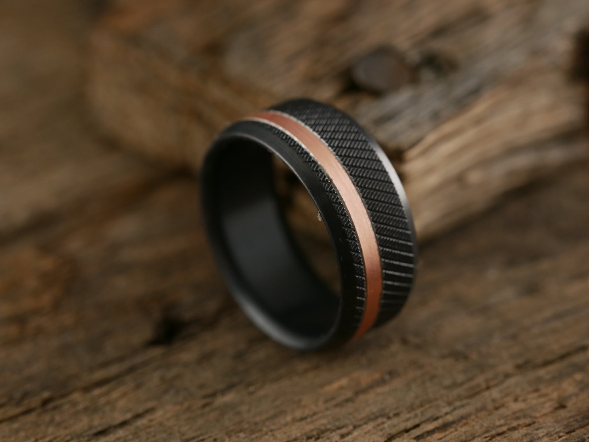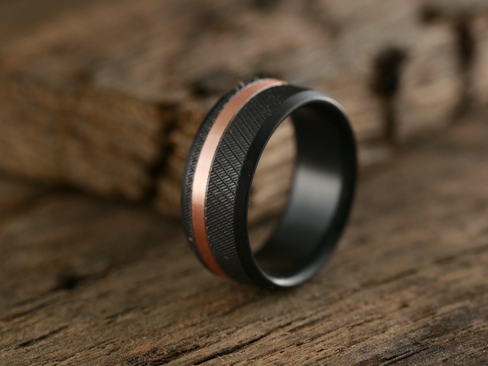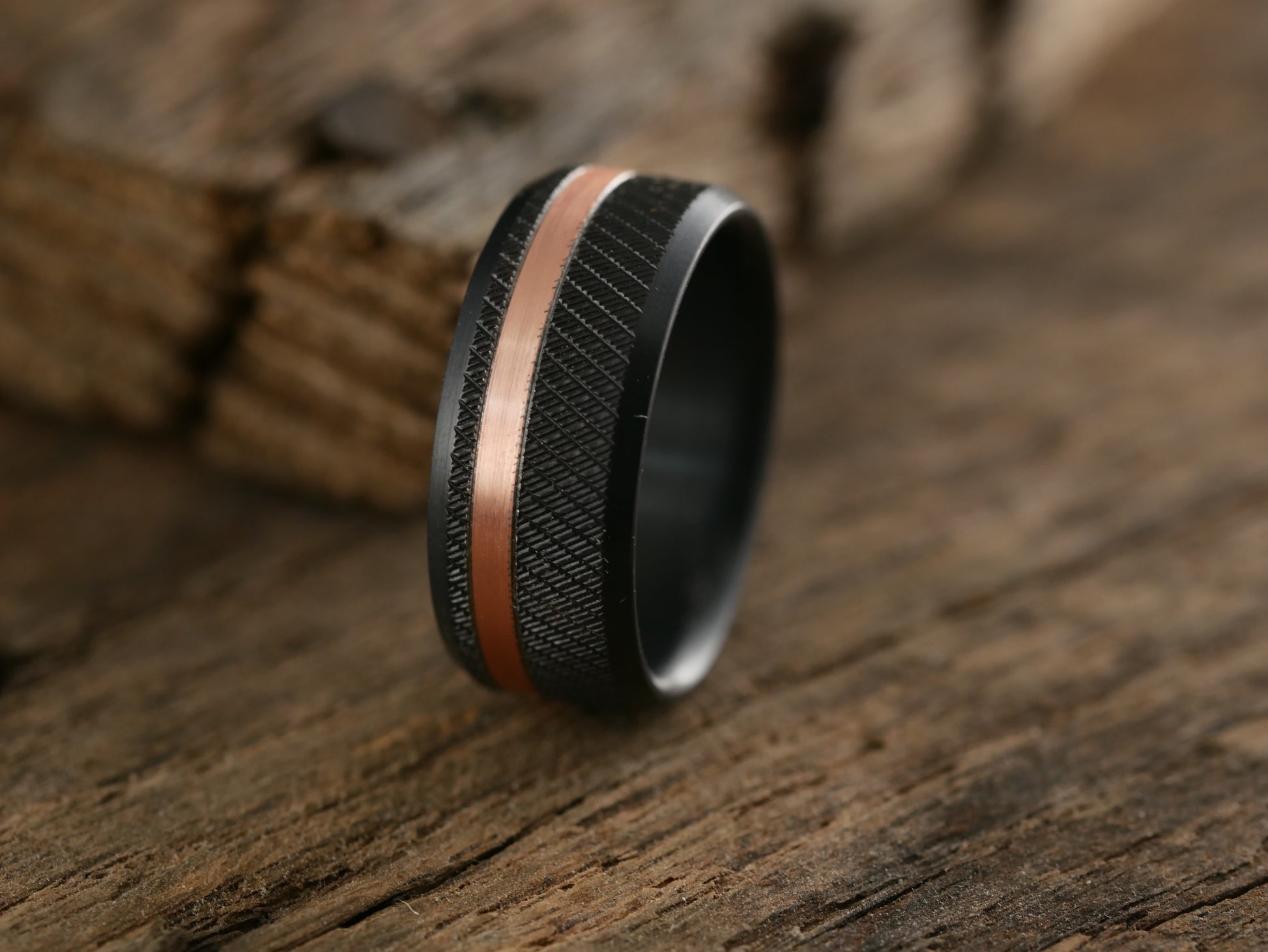 This ring is also available without texture. This men's wedding band is totally unique! Handcrafted to your specifications from grade 5 titanium with a pure copper inlay. Titanium is used in the most demanding, high-tech applications in the world! Just a few of the places titanium is used is on the SR-71 Blackbird (the fastest aircraft made), the space shuttle, the SpaceX program, fighter jets, and tons of other super cool places! If it holds up to outer space and Mach speeds, you know it'll last forever on your finger! *Knurl pattern may vary depending on ring size Free shipping in the USA! Every Richter Scale ring is covered by our 100% Guarantee |